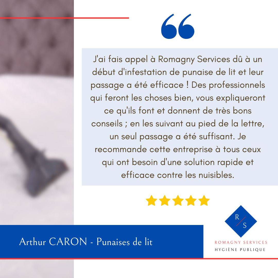 Je tiens à exprimer mon entière satisfaction suite à l’intervention de l’équipe Romagny Services pour le traitement de mon problème de punaises de lit.